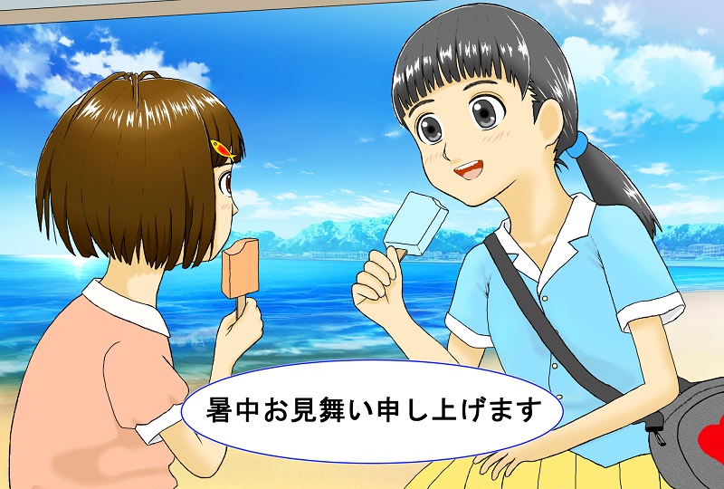 お嬢様と、お嬢様の妹さんが、海水浴場の浜茶屋でアイスを食べながら談笑する様子を描いてみました^^